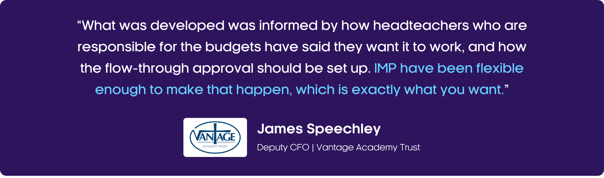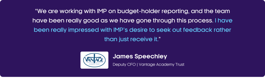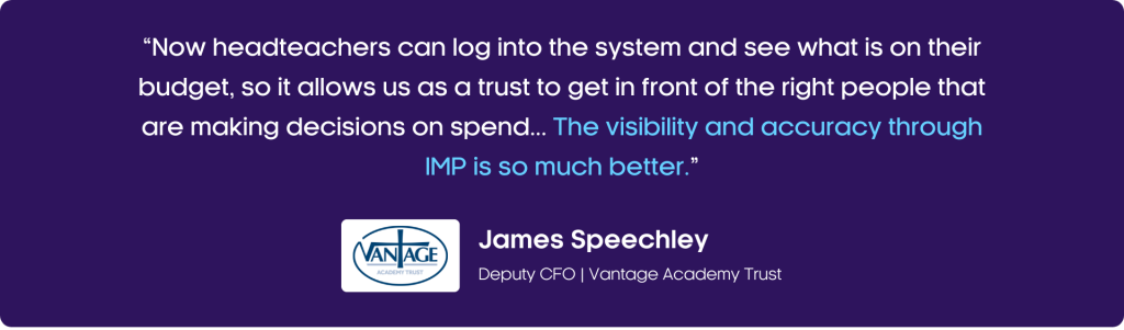 James continued: “Now we have Purchasing, which works better for the way Vantage wants its schools to operate, we expect the schools to be doing what they should be doing to control their finances, and use the system to its maximum. We are working with IMP on budget-holder reporting, and the team have been really good as we have gone through this process. I have been really impressed with IMP’s desire to seek out feedback rather than just receive it.”
