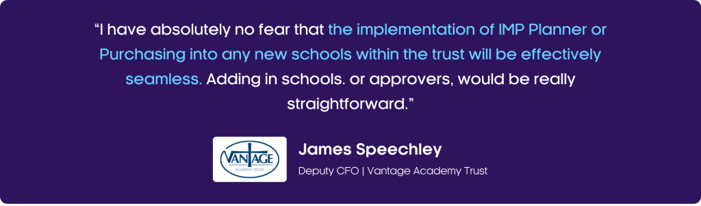 James added: “Vantage is an ambitious trust and is seeking to grow, rather than consolidate. Naturally we want the 10 schools already within the trust to keep improving, then taking that improvement out into new schools and becoming a larger trust. I have absolutely no fear that the implementation of IMP Planner or Purchasing into any new schools within the trust will be effectively seamless. Adding in schools. or approvers, would be really straightforward.”